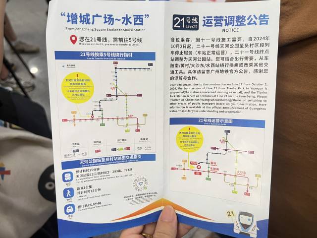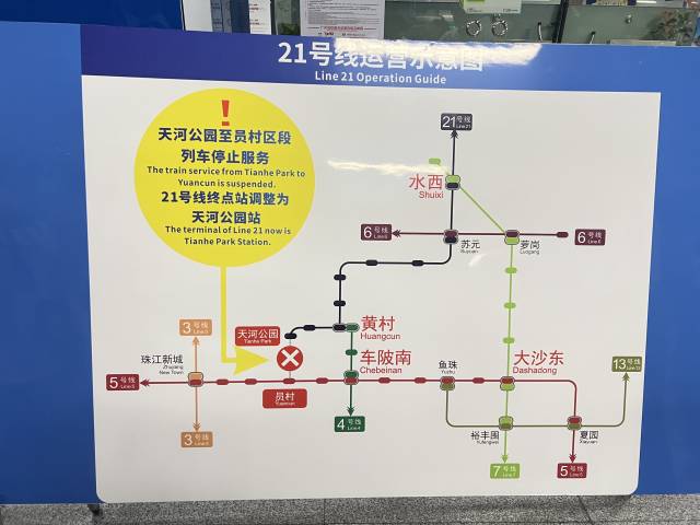 9月11日,广州地铁宣布,为实现广州轨道交通首条环线号线号线天河公园至员村区段将从10月2日起进行拆解施工,届时21号线终点站将由员村站调整为天河公园站。