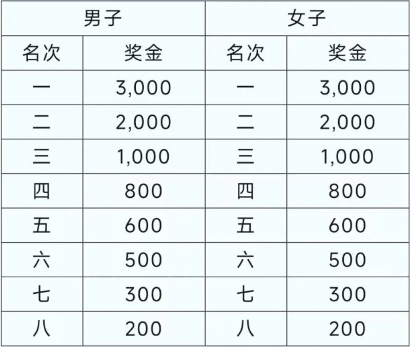 男、女第一至第八名(按枪成绩)选手分别获得如下表奖金(见正文),欢乐跑项目不设名次奖,完赛选手可自行在官方APP第一赛道下载打印纪念证书。