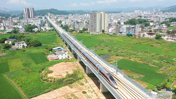 人民网北京9月12日电 (记者王连香)记者从中国国家铁路集团有限公司(以下简称国铁集团)获悉,新建龙岩至龙川高铁梅州西至龙川西段(以下简称龙龙高铁梅龙段)将于9月14日开通运营,梅州西站至龙川西、广州东、深圳北站间最快29分、1小时47分、1小时36分可达,为粤东老区加速融入粤港澳大湾区注入新动能。 复兴号奔驰在梅龙线上。!